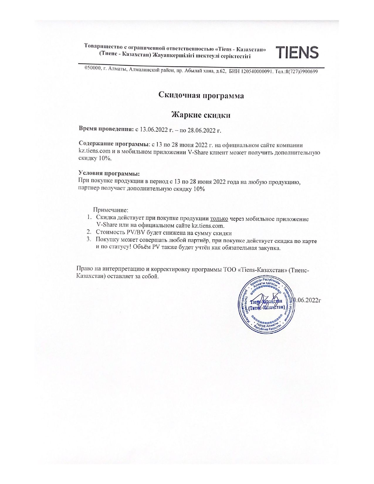 Содержание программы: с 13 по 28 июня 2022 г. на официальном сайте компании kz.tiens.com и в мобильном приложении V-Share клиент может получить дополнительную скидку 10%