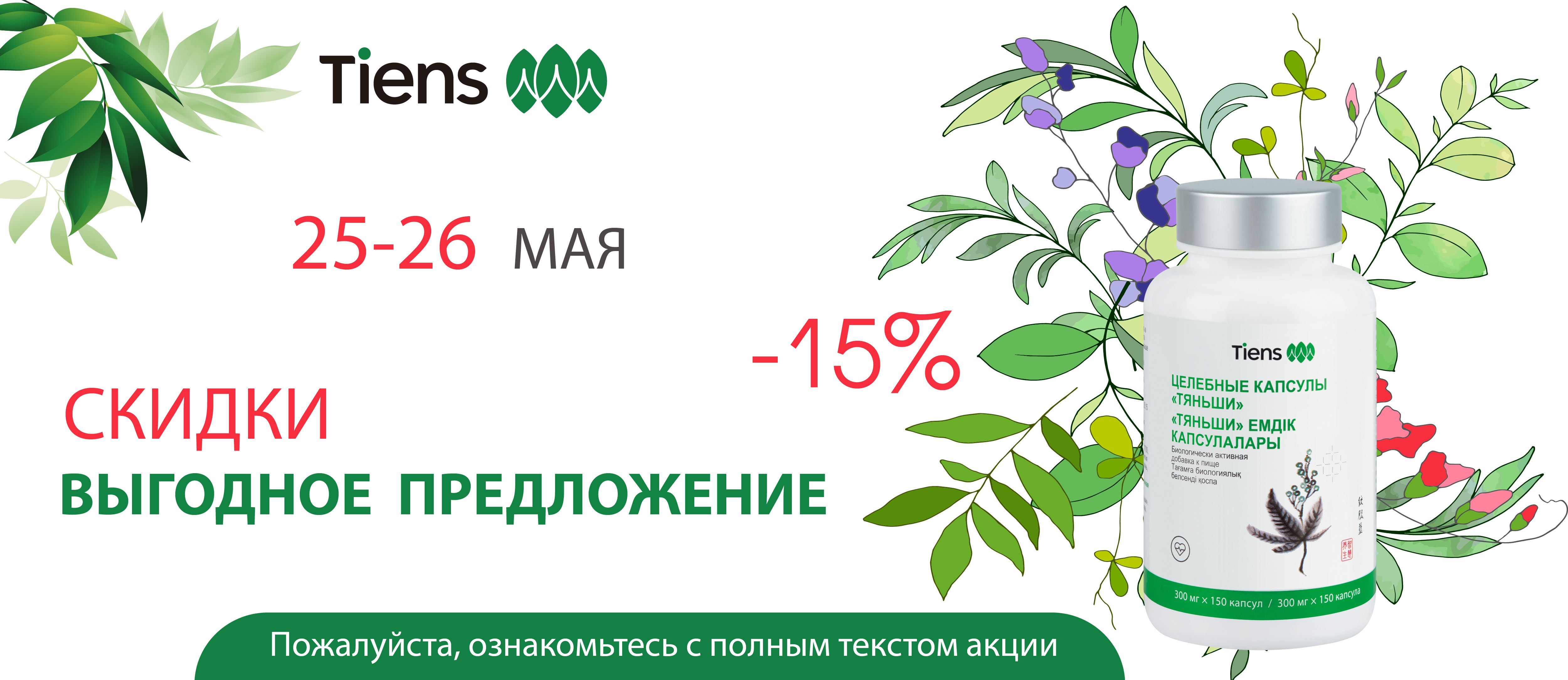 Содержание программы: с 25 по 26 мая на официальном сайте компании kz.tiens.com и в мобильном приложении VShare на продукцию установлена дополнительная скидка 15% .