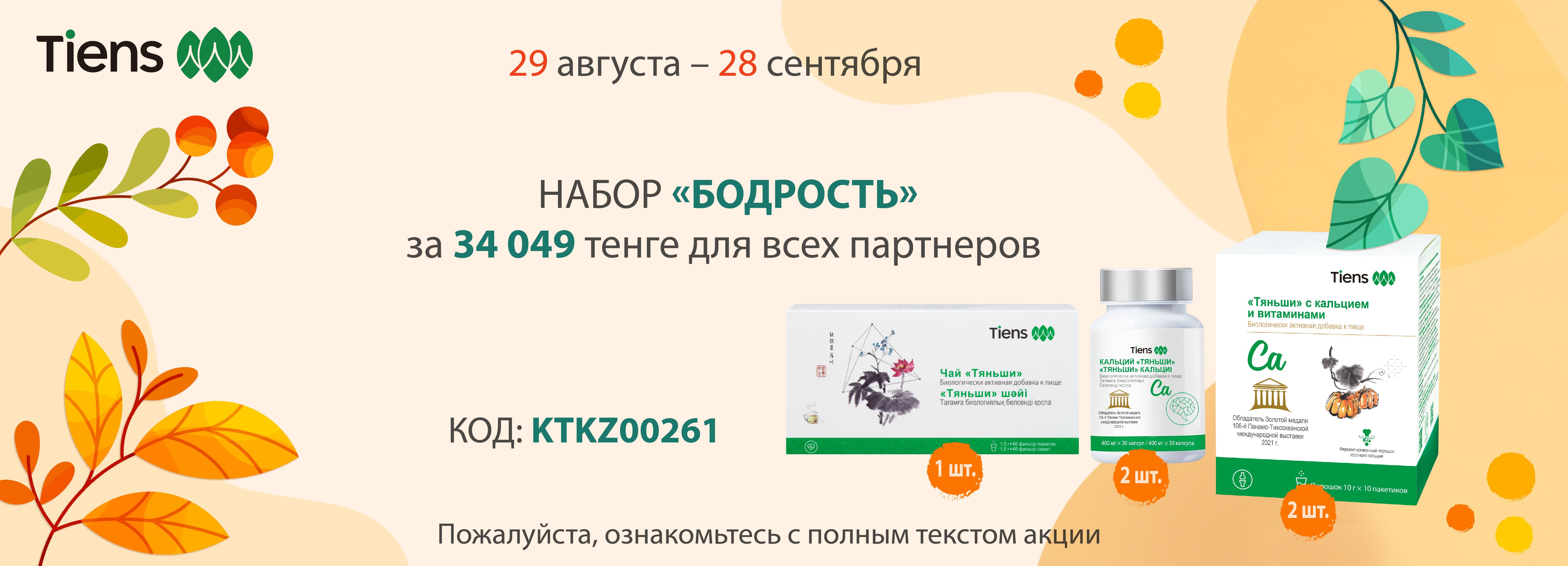 Любой партнёр в период действия акции может купить 1 набор «Бодрость» под кодом KTKZ00261, в который входит 2 шт. «Тяньши» с кальцием и витаминами, 2 шт. Кальций «Тяньши 1шт Чай «Тяньши», за 34 049 тенге (80PV/79.2BV)