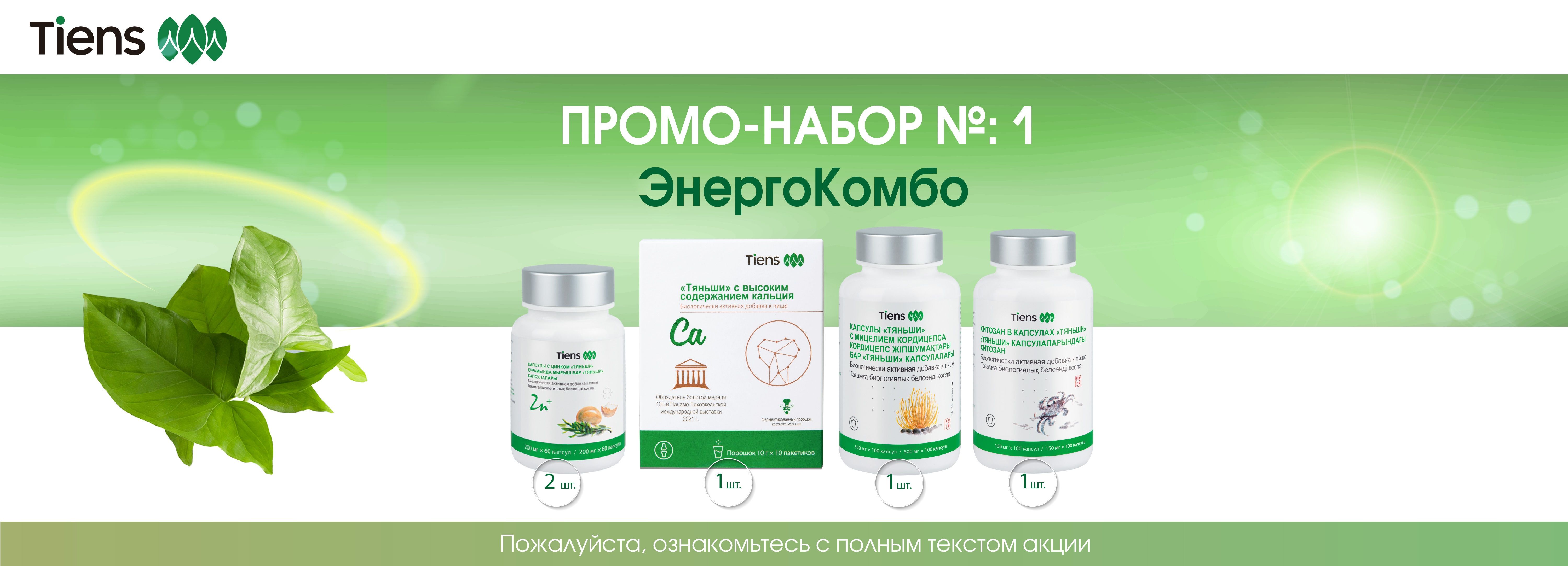 Любой партнер в период действия акции может купить 1 набор «ЭнергоКомбо» под кодом KTKZ00327, в который входит 1 шт. Хитозан в капсулах «Тяньши», 1 шт. Капсулы "Тяньши" с мицелием кордицепса, 2 шт. Капсулы с цинком «Тяньши», 1 шт. «Тяньши» с высоким содержанием кальция за 52214 тенге. (111PV/ 109,89BV)