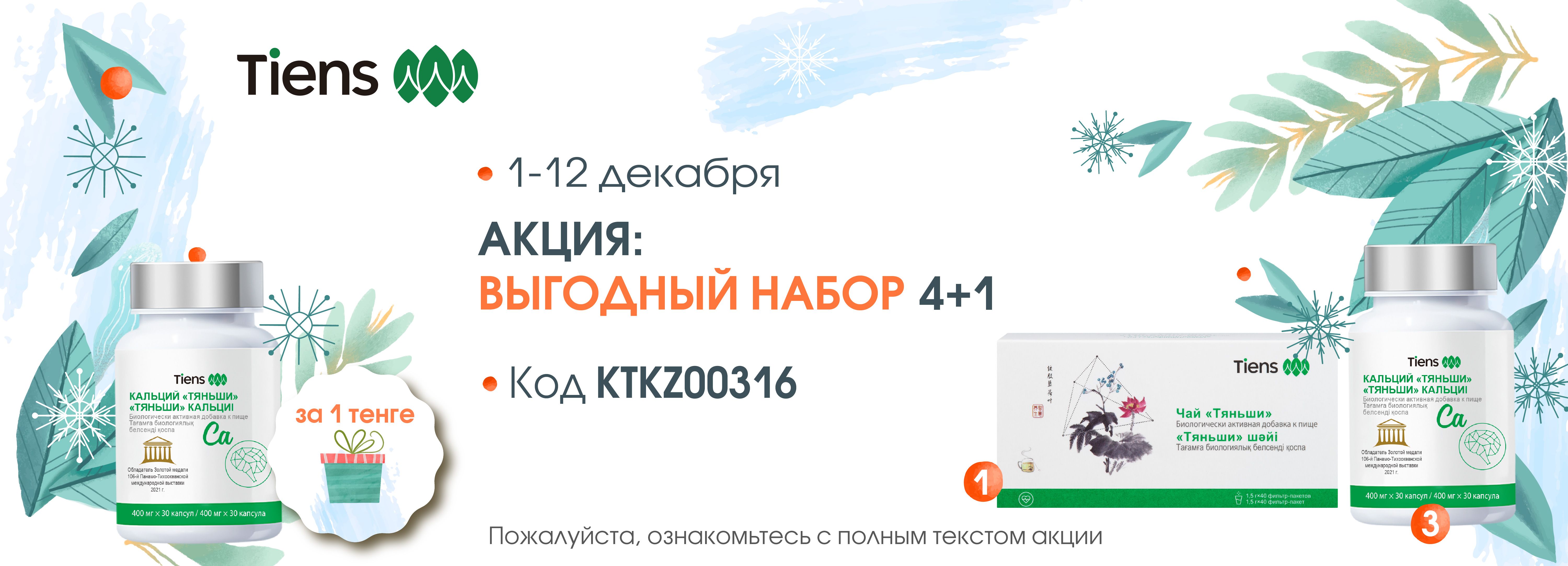 Любой партнёр в период с 1 по 12 декабря 2024г, может купить 1 набор «4+1» под кодом KTKZ00316, в который входит 4 упаковки " Кальций "Тяньши" и 1 упаковку Чай «Тяньши за 25871 тенге, 55PV.